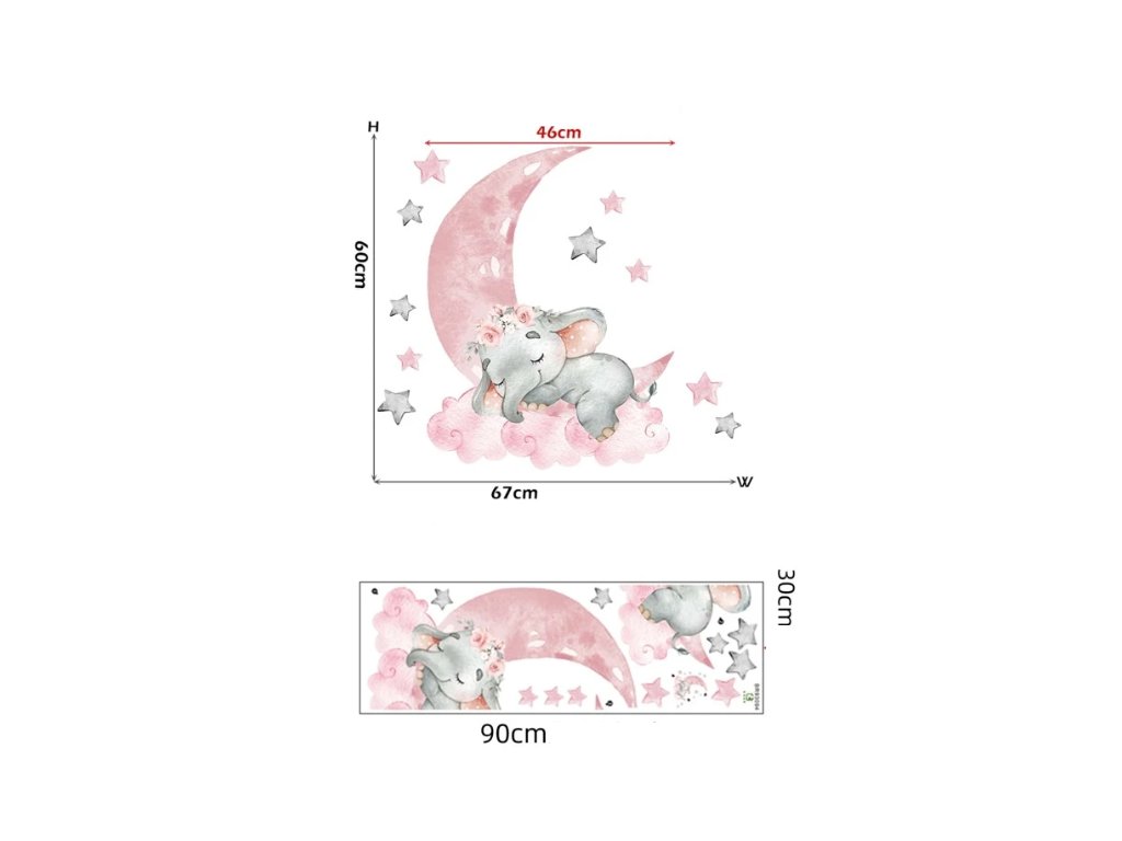 Varázsolj egyedi hangulatot gyermeked szobájába ezzel a bájos falmatricával! Egy cuki elefánt pihen a holdon rózsaszín, szürke csillagok között.